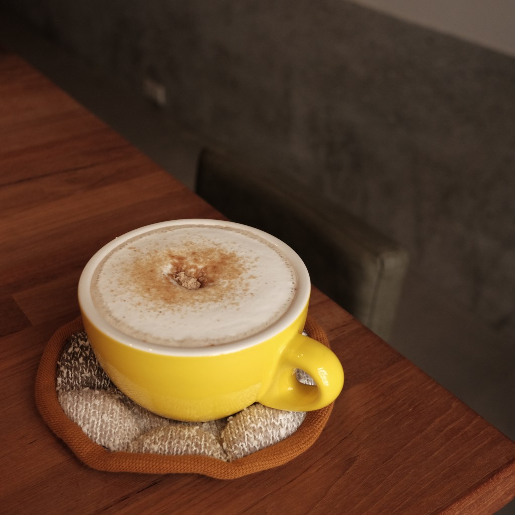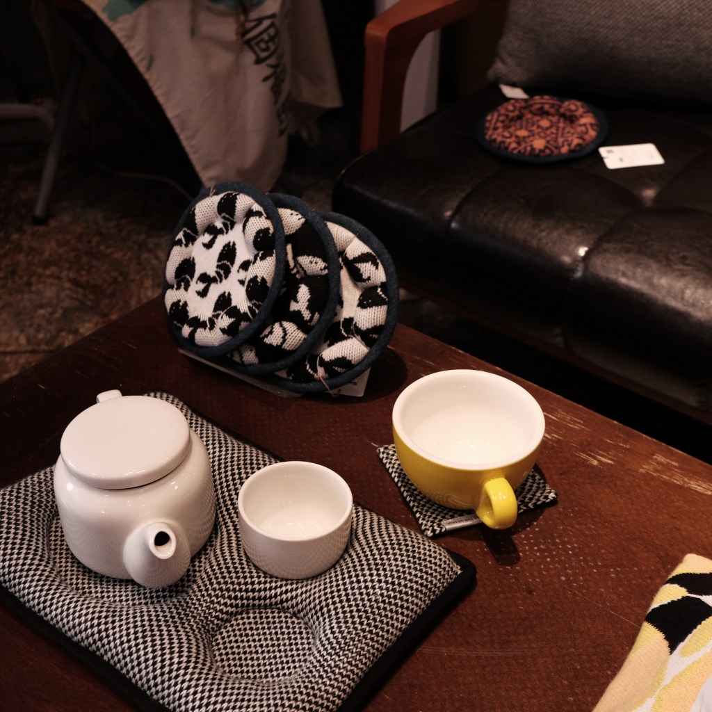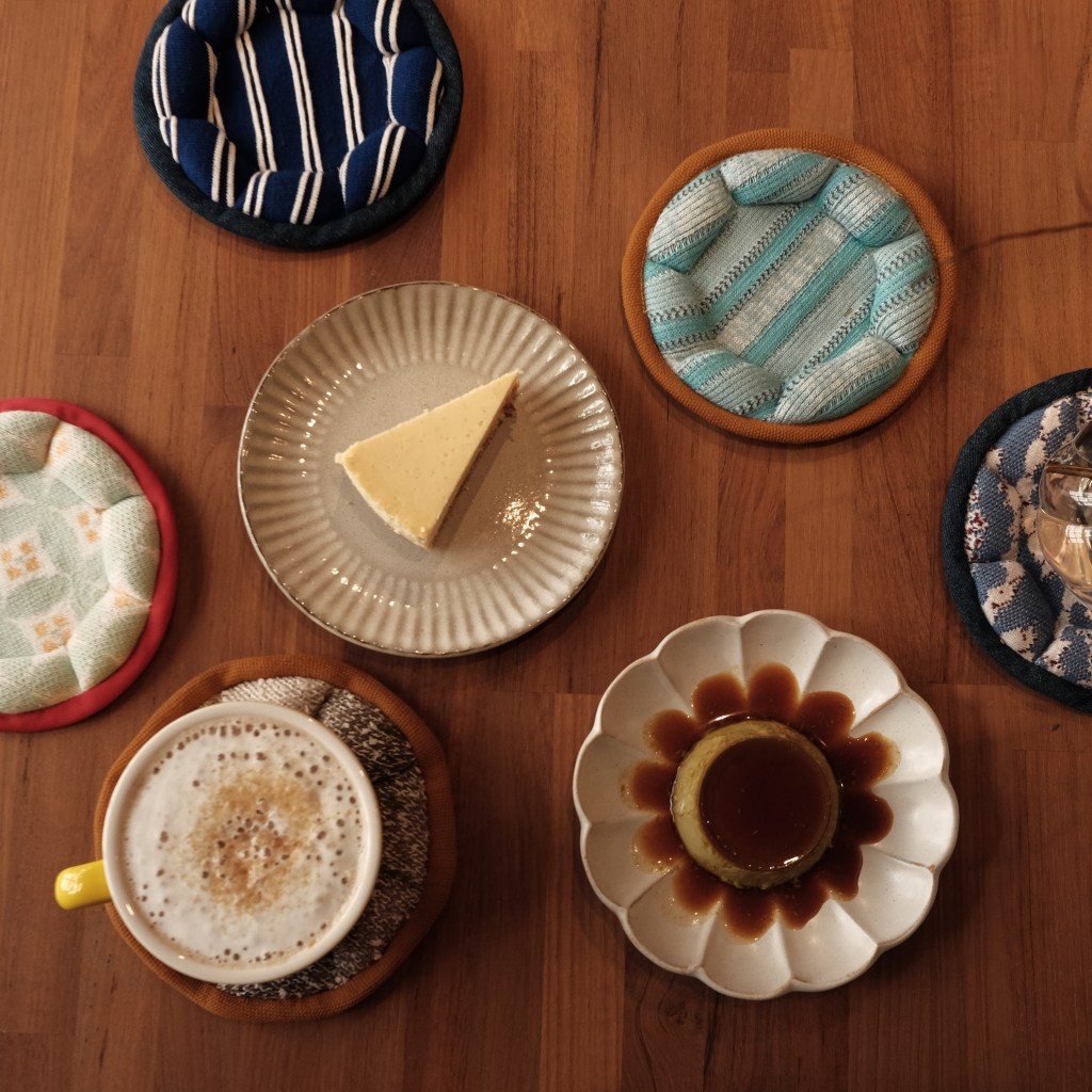 飲品上桌前都搭配專門設計的針織杯墊,圓形的軟墊,周圍一圈圈鼓起,將杯子包圍起來,形狀看起來像甜甜圈,蓬鬆柔軟,摸起來也很治癒,完美演繹專屬《在場》的閒適氣息。